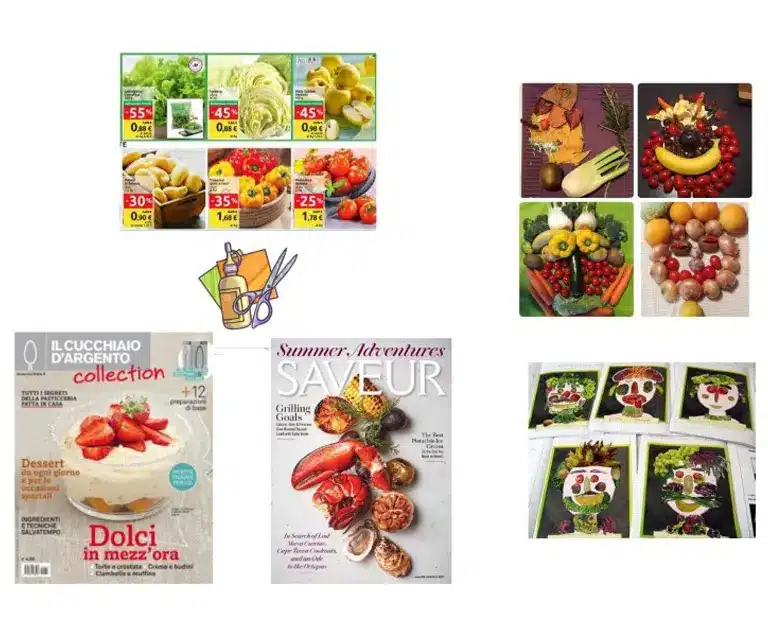 Ritagliate immagini di frutta e verdura di colori e dimensioni varie da riviste e volantini dei supermercati cercando una grande varietà di forme, colori, generi.