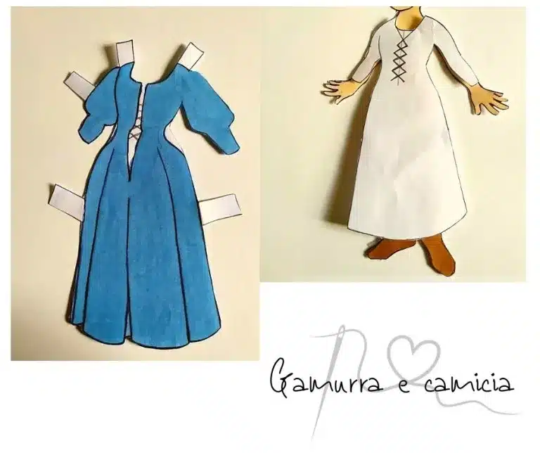 La “gamurra” (Fig.1) è l’elemento base dell’abbigliamento femminile: più o meno ricca a seconda delle classi sociali, si presenta lunga fino ai piedi, stretta sotto il seno e in vita mentre è larga nella lunghezza.