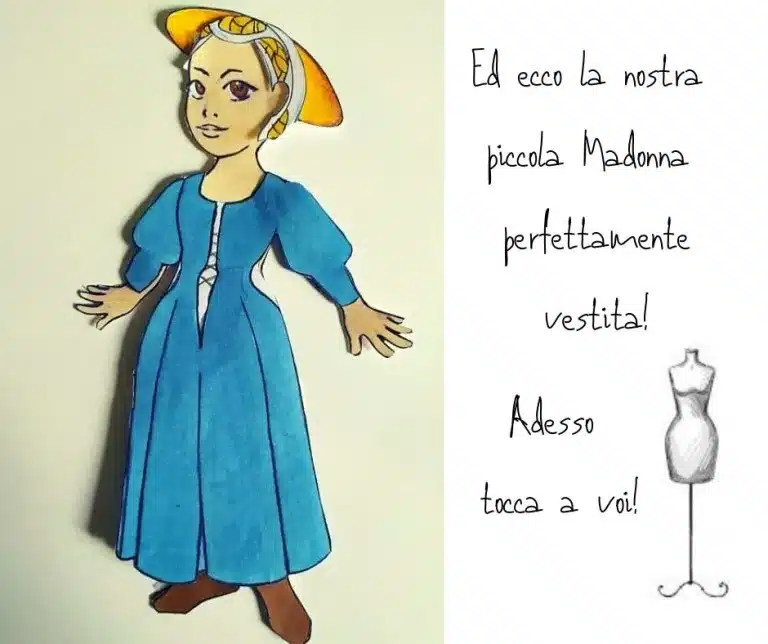 La nostra attività prevede il disegno di una bambolina di carta, perfettamente vestita come la nostra Madonna del Parto, cioè come una dama del ‘400!